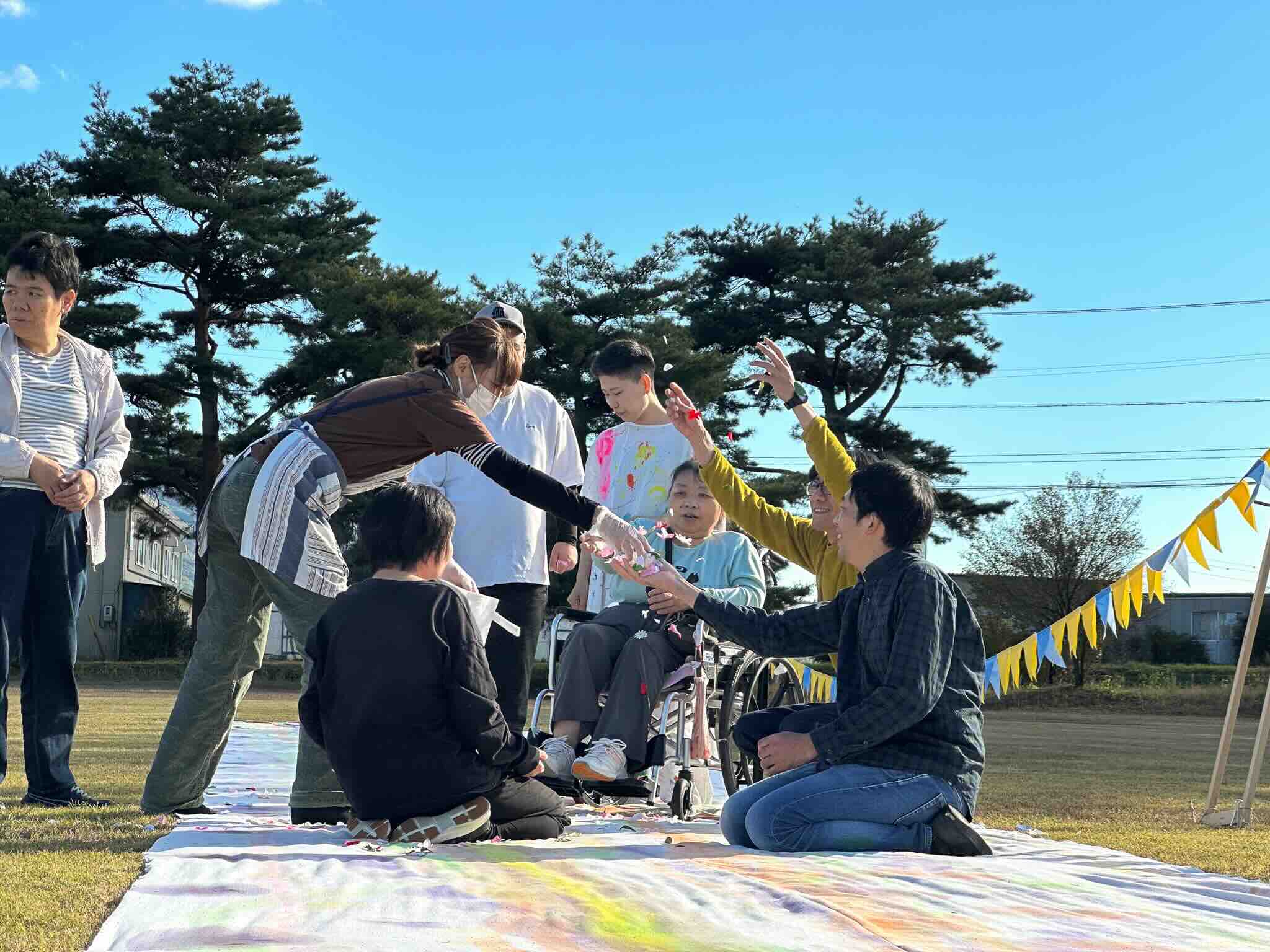 「作品」は、その場に集い、共に時間を過ごした人々の関係性から生まれた表現だ。芝生の上に敷かれた24メートルの長い布に残る色やにじみは、利用者や支援者だけでなく、この場所を訪れたすべての人の“歩みの記録”であり、出会いと対話が重なり合った軌跡そのものだ。