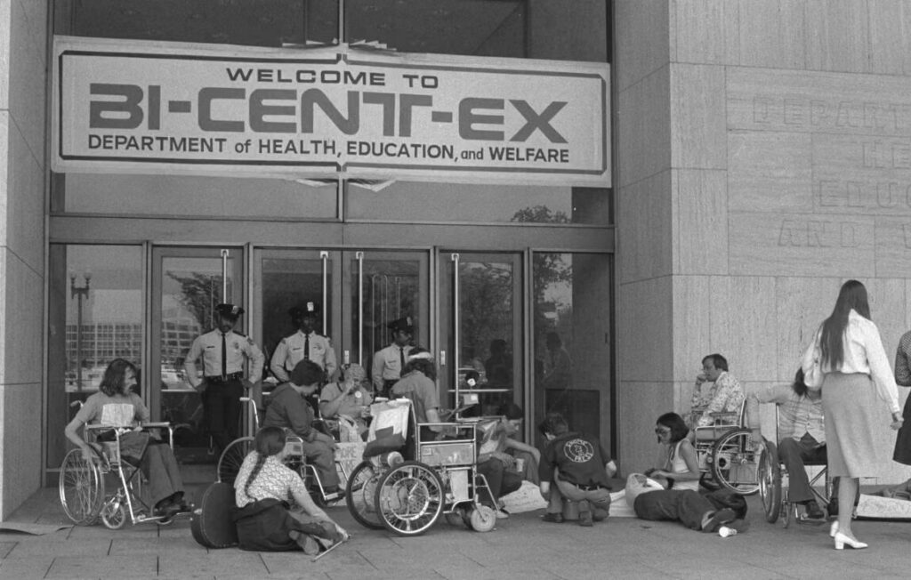 (1977年4月22日にアメリカ合衆国保健福祉省の長官官房が位置する建物の入口で、座り込み抗議を行う障がい者の権利運動の活動家たちの写真)