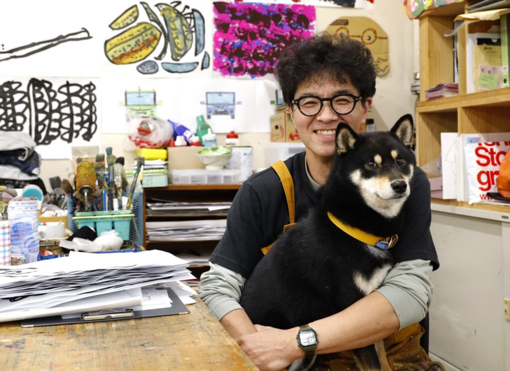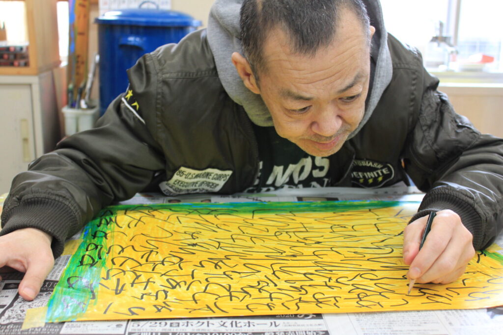 春日氏は積極的に制作に取り組まれており、カラフルな色使いと画面を埋める文字のような形が印象的な作家です。