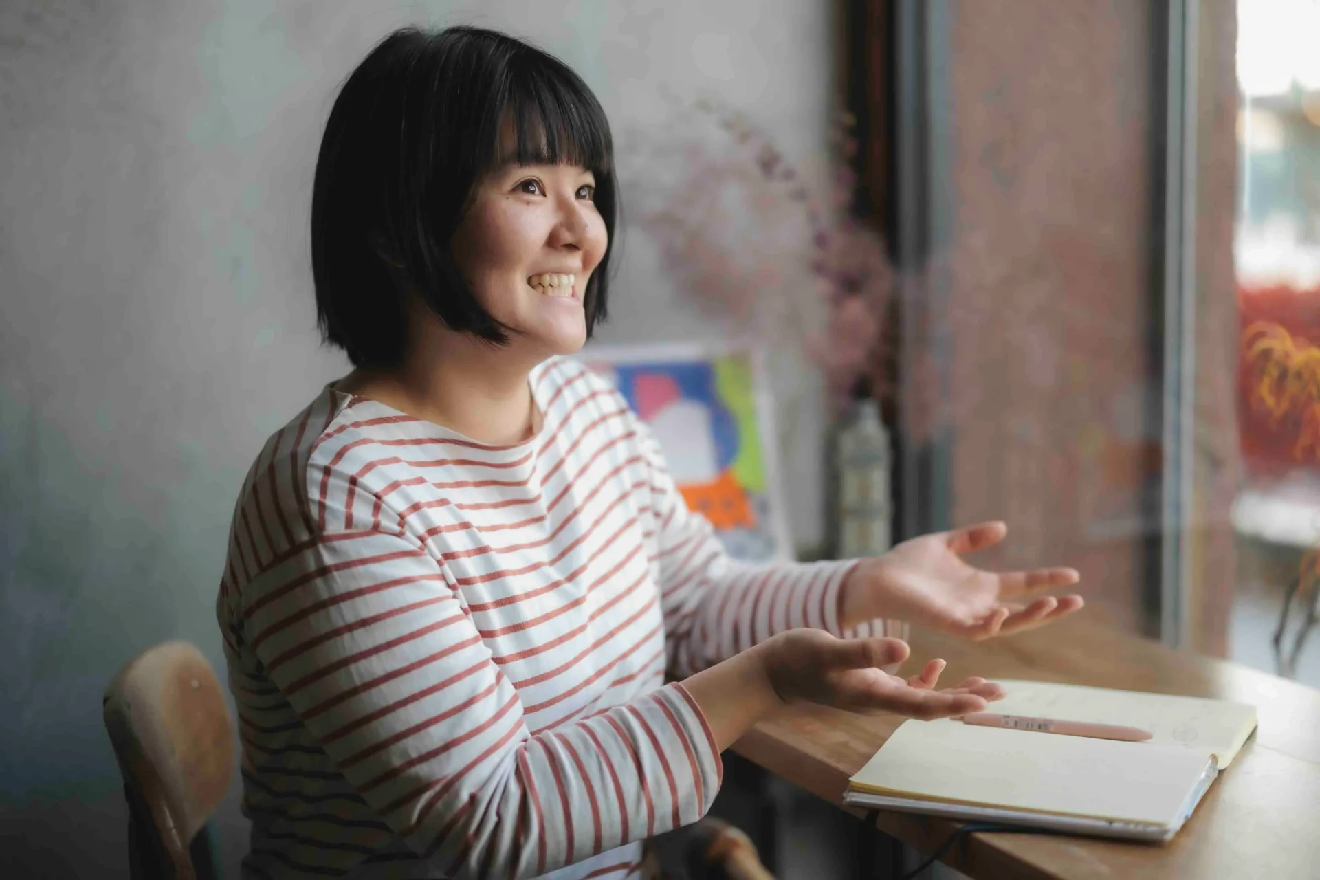 長野県松本市。北アルプスを望む城下町にはブックカフェ「栞日(しおりび)」と、その向かいの銭湯「菊の湯」があります。今回、ナナイロでは街の「日常」を耕し続ける人として、栞日と菊の湯を営む、株式会社栞日役員の鮎沢日菜子さんに話を聞きました。2022年より栞日には、ナナイロが主催する対話アートの展示会場をご提供いただいています。展示された作品を媒介にして「地域における障がいとの自然な向き合い方」についてインタビューしました。大きな作品の「一部」としての展示ー 今回、栞日での展示について、最初の印象はいかがでしたか。鮎沢:去年の作品は、個人の方が書かれたそれぞれの作品だったと記憶していますが、今年は一つ大きな作品を飾ってらっしゃるんだなって。栞日でも一人の作家の作品を飾ったりとか、一点一点を飾るってことはよくあるんですけど、大きな作品の一部を栞日で見れるっていうのは、すごく新鮮だなと思いました。「どういう展示なんだろう?」と思ってお迎えしたっていうのが、最初の印象です。「これは作品の一体どの部分なんだろうか?」と思っていたのですが、設営の翌日に自転車が来て、「おお、そういう感じになるのか!」と感じでした。紹介の文章やQRコードで動画を見たところ、「あ、なるほど。市街でこういうふうに展開されてるんだ」であったり、作品を作った段階からもう展示が始まってたんだなみたいなことを感じて、すごく面白い作品だなと見させていただきました。来場者の「なぜ?」から始まる対話ー お客さんの反応はいかがですか。鮎沢:「なんで自転車があるんですか?」とか、「靴は忘れ物ですか?」というところから入る方が多いですね。「これは作品の一部なんです」とお話ししながら一緒に見ることもあります。「この展示を見に来ました」という方もいて、スタッフにとっても作品との接点を持つ機会になりました。アートや障がいへの距離感の違いー 立体作品という点で、きっと鑑賞のされ方もさまざまでしょうね。鮎沢:本当にいろいろです。外から覗いて文章を読んでいく方もいれば、中に入ってグッと近づいて見る方もいる。それ自体が、アートや障がいとの関わり方の「今」を表しているように感じます。アートに慣れている人は近づくし、「絵がアート」という感覚の人は、「これは何だろう?」と戸惑って帰られることもある。障がいのある方が関わっていると知って関心を持つ人もいれば、「そうなんだ」で終わる人もいる。その全部が、今の社会の距離感なんだと思います。「言葉」が呼び起こす記憶と現場のリアリティ鮎沢:マツモトアートセンターのモニターの周りに貼られていた「言葉」の展示が、特に印象に残っています。あの言葉を見て、「あ、こういう言葉の中で私は仕事をしていたな」と、福祉の現場での日々を強く思い出しました。利用者さんたちの独特な言い回しや、日常の中の何気ない言葉が、私の中で当時関わっていたあの人とあの人とあの人の顔が浮かぶ、みたいな感じになりました。生活のディテールが大切にされていて、あの「言葉の展示」がとても好きです。カフェという「公共的な場」が生む、多様な接点ー 栞日さんはカフェとして街の日常に溶け込んだ場所でありながら、ある意味では「公共財」に近い役割も担っていらっしゃるように感じます。そうした日常の場で、今回のような活動やアート展示に場所を提供することには、どのような意義やメリットがあるとお考えでしょうか。鮎沢:栞日では、プロのアーティストの作品も、街の方の手芸作品も、そして今回のような障がいのある方とアーティストが一緒につくる作品も展示します。普通のギャラリーだと、何かに偏りがちですが、ここではだいたい月替わりでいろんなものが入れ替わる。とても多様性のある場所だと思っています。カフェと書店の中にあることで、展示目当てじゃない方とも自然と接点が生まれる。それがすごくいいところだなと思っています。「力が活かされる社会」を求めてー 鮎沢さんは元々は福祉のお仕事をされていたとお聞きしています。鮎沢:前職は愛知県の福祉系NPOで、生活介護や訪問介護、移動支援などをしていました。公園のパトロール作業を一緒にしたり、イオンや映画、カラオケに出かけたり。ご家族の時間を取れるよう障がいのあるお子さんと一緒に外出する、という支援もしていました。ー Uターンで松本に戻ってきた時に、就職先の業界を変えたのはなぜでしょうか。鮎沢:高校生の頃から福祉に興味があったのですが、「一緒にいられる社会」というよりも、「その人たちの力が活かされる社会とは何だろう」と考えていました。福祉の現場で支援の対象になっている人たちは、とても興味深くて、魅力的で、私たちにはない力を持っているのに、街で暮らしていると、なかなか出会わない。そのことがずっと不思議だったんです。「こんなにすごい人たちと、なぜ日常の中で出会わ